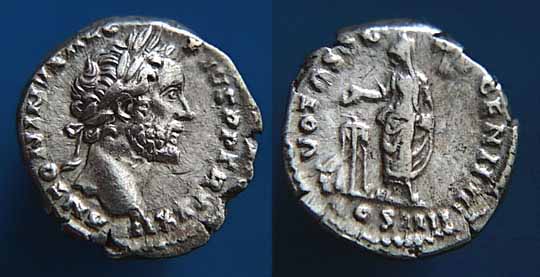 Аверс: ANTONINVSAVGPIVSPPTRPCOSIII - Голова в лавровом венке влево.