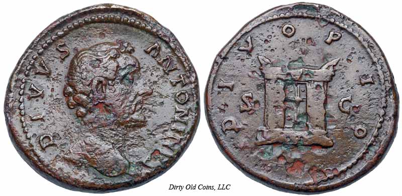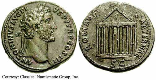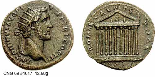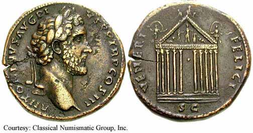 Реверс: COSIIII SC - Храм с двумя колоннами; Антонин Пий внутри, с поднятой рукой. 148-149 (Рим).