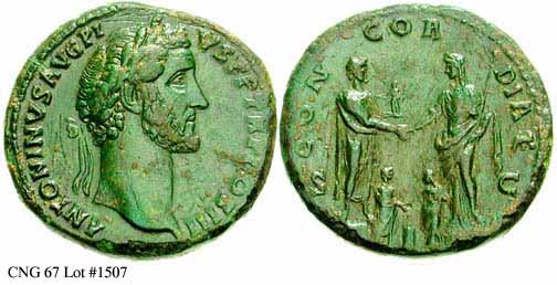 Реверс: AVRELIVSCAESAVGPIIFCOS SC - Непокрытая голова, в драпировке бюст вправо. 140-144 (Рим).