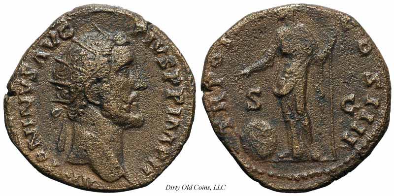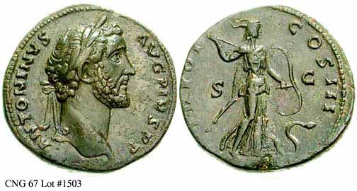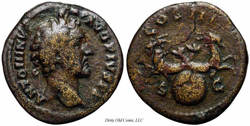 Реверс: COSIIII - Антонин Пий стоит влево, держит глобус. 151-152 (Рим). $1, 800 1/13/03.