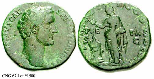 Аверс: IMPCAESTAELHADRANTONINVSPIVSPP - Непокрытая голова вправо.