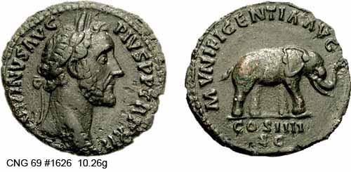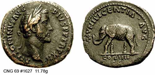 Реверс: MVNIFICENTIAAVG Монетный двор: COSIIII/SC - Слон идёт вправо. 148-149 (Рим).