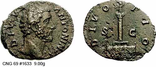 Реверс: DIVOPIO - Колонна со статуей Антонина Пия сверху. 162 (Рим).
