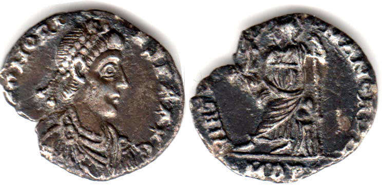 Гонорий держит скипетр и руку на щите. Победа его коронует. / Виртус (Мужественность) войска